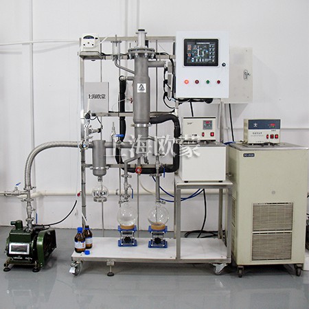 由采用垂直刮板成膜設計,物料在加熱壁上的停留時間短,對其他蒸餾而言,受熱時間一般較長(30分鐘以上甚至幾十個小時),而短程蒸餾僅為十幾秒。由于短程蒸餾加熱壁與冷凝器間有嚴格的距離要求,由液面逸出的輕分子,幾乎瞬時就到達冷凝面,汽相輕分子受熱時間在這個過程中可以忽略不計。熱分解的可能被*小化。